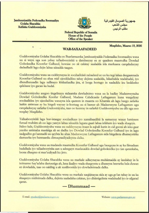 War-saxaafadeedkaan ka soo baxay xafiiska Guddoomiyaha baarlamaanka waxa uu u qornaa sidatan:-
