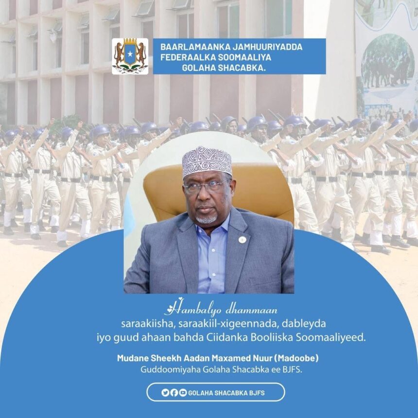Muqdisho,(SONNA):- Guddoomiyaha Golaha Shacabka ee Baarlamaanka Jamhuuriyadda Federaalka Soomaaliya Mudane Sheekh Aadan Maxamed Nuur (Madoobe) ayaa munaasabadda xuska Sanad-guuradii 82-aad ee ka soo wareegtay aas-aaskii Ciidanka Booliiska Soomaaliyeed awgeed hambalyo iyo bogaadin u diray dhammaan saraakiisha, saraakiil-xigeennada, dableyda iyo guud ahaan bahda Ciidanka Booliska Soomaaliyeed.