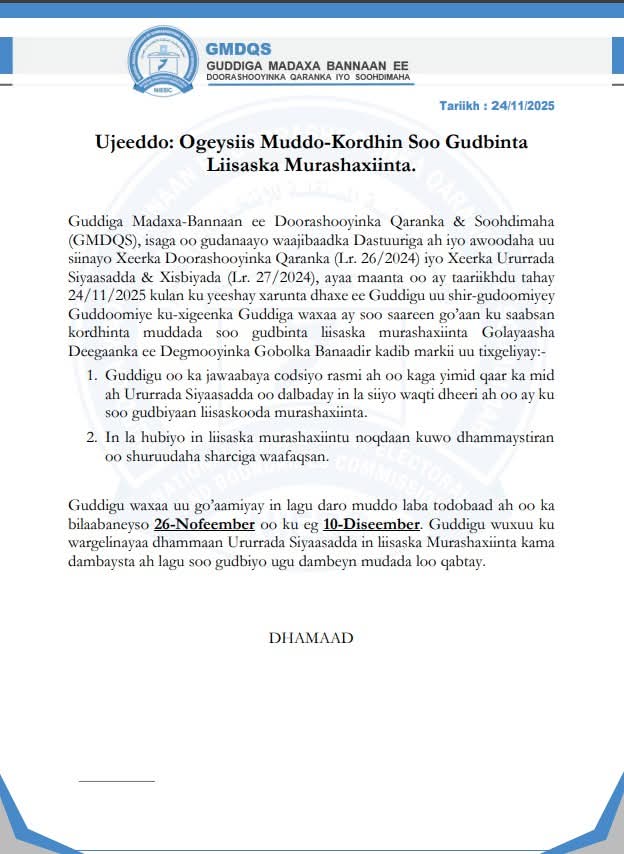 Muqdisho(SONNA(:-Guddiga Madaxa-Bannaan ee Doorashooyinka Qaranka iyo Soohdimaha (GMDQS), isaga oo gudanayo waajibaadka Dastuuriga ah iyo awoodaha uu sinayo Xeerka Doorashooyinka Qaranka (Lr. 26/2024) iyo Xeerka Ururrada Siyaasadda iyo Xisbiyada (Lt. 27/2024), ayaa maanta oo ay taariikhdu tahay 24/11/2025 kulan ku yeeshay xarunta dhaxe ee Guddigu uu shir-gudoomiyey Guddoomiye ku-xigeenka Guddiga waxaa ay soo saareen go’an ku saabsan muddada soo gudbinta liisaska murashaxiinta Golayaasha
