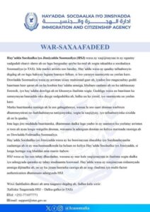 Muqdisho,(SONNA):- War-saxaafadeed ka soo baxay Hey’adda Socdaalka iyo Jinsiyadda ayaa lagu xaqiijiyay inay ogaatay xadgudub sharci-darro ah oo lagu beegsaday qeybo kamid ah xogta rakaabka ku socdaalaya Soomaaliya ee (e-TAS).