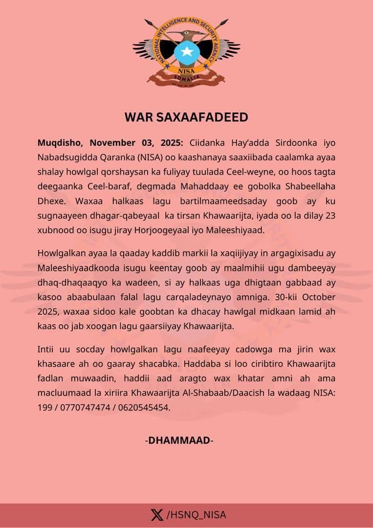 Muqdisho(SONNA)-: Ciidanka Hay’adda Sirdoonka iyo Nabadsugidda Qaranka (NISA) oo kaashanaya saaxiibada caalamka ayaa shalay howlgal qorshaysan ka fuliyay tuulada Ceel-weyne, oo hoos tagta deegaanka Ceel-baraf, degmada Mahadaay ee gobolka Shabeellaha Dhexe. Waxaa halkaas lagu bartilmaameedsaday goob ay ku sugnaayeen dhagar-qabayaal ka tirsan Khawaarijta, iyadoo la dilay 23 xubnood oo isugu jiray Horjoogeyaal iyo Maleeshiyaad.