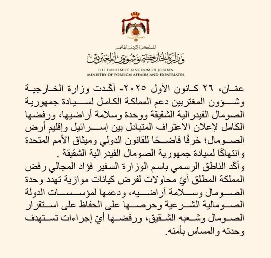 Warsaxaafadeed kasoo baxay Wasaaradda Arrimaha Dibadda ee Boqortooyada Jordan ayaa lagu sheegay in dowladda Jordan ay si adag uga soo horjeeddo ku dhawaaqista Israa’iil ee aqoonsi ku sheega Maamulka Somaliland. Jordan waxay tallaabadaas ku tilmaantay mid si cad u jebinaysa sharciga caalamiga ah iyo Axdiga Qaramada Midoobay, isla markaana xadgudub ku ah madax-bannaanida, midnimada iyo wadajirka dhuleed ee Jamhuuriyadda Federaalka Soomaaliya.