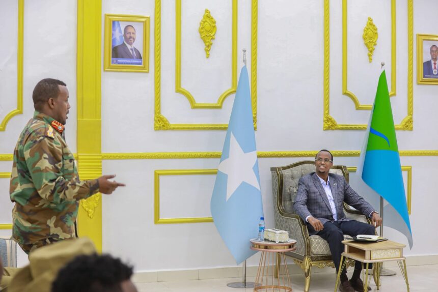 Jowhar,(SONNA):- Madaxweynaha Dowladda Hirshabeelle Mudane Cali Cabdullaahi Xuseen (Cali Guudlaawe) ayaa shir-guddoomiyey kulan diirada lagu saaray oo ay ka qeybgaleen saraakiisha ciidamada Booliiska, Xogga Dalka iyo Nabad-sugida.
