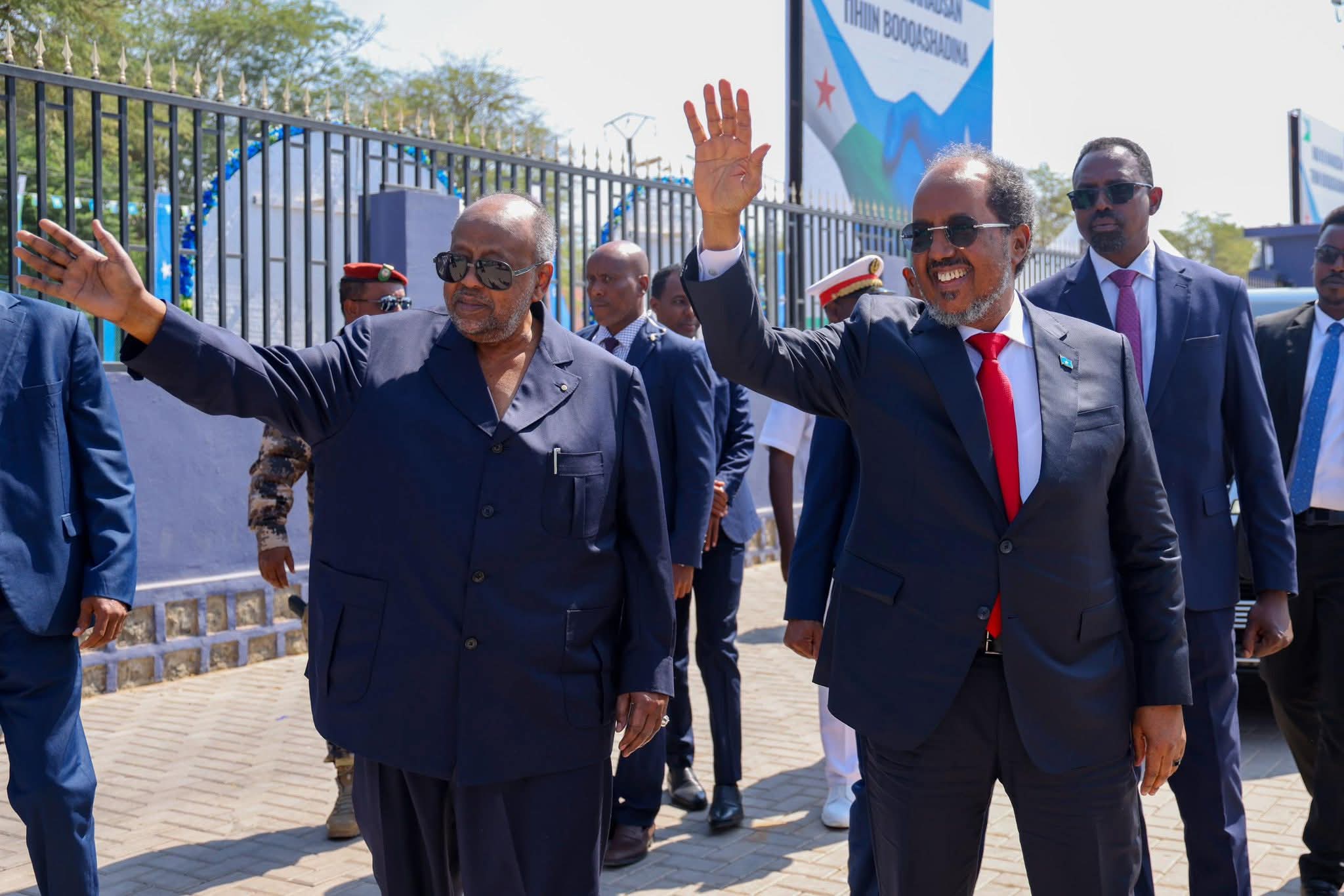 Jabuuti(SONNA):-Madaxweynaha Jamhuuriyadda Federaalka Soomaaliya Mudane Xasan Sheekh Maxamuud iyo Madaxweynaha Jamhuuriyadda aan walaalaha nahay ee Jabuuti Mudane Ismaaciil Cumar Geelle ayaa maanta si wadajir ah uga qeyb galay munaasabadda Xuska 25-guurada Shirweynihii Nabadaynta Soomaaliyeed ee Carta oo horseeday dib u dhiska dowladdnimada dalkeenna.
