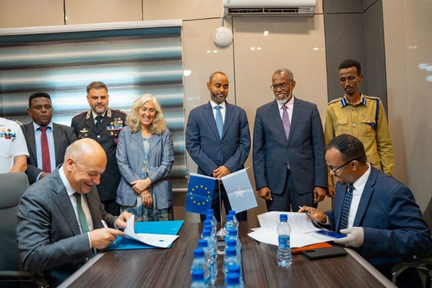 Heshiiskan oo ah mid iskaashi ah oo la xariira sidii Midowga Yurub ay u taageeri lahaa qalabeynta xarunta Samatabixinta Dhibanaayasha Badda ee MRCC, kaas oo qeyb ka ah mashaariicda lagu xoojinayo horumarinta Dekedda magaalada Muqdisho.
