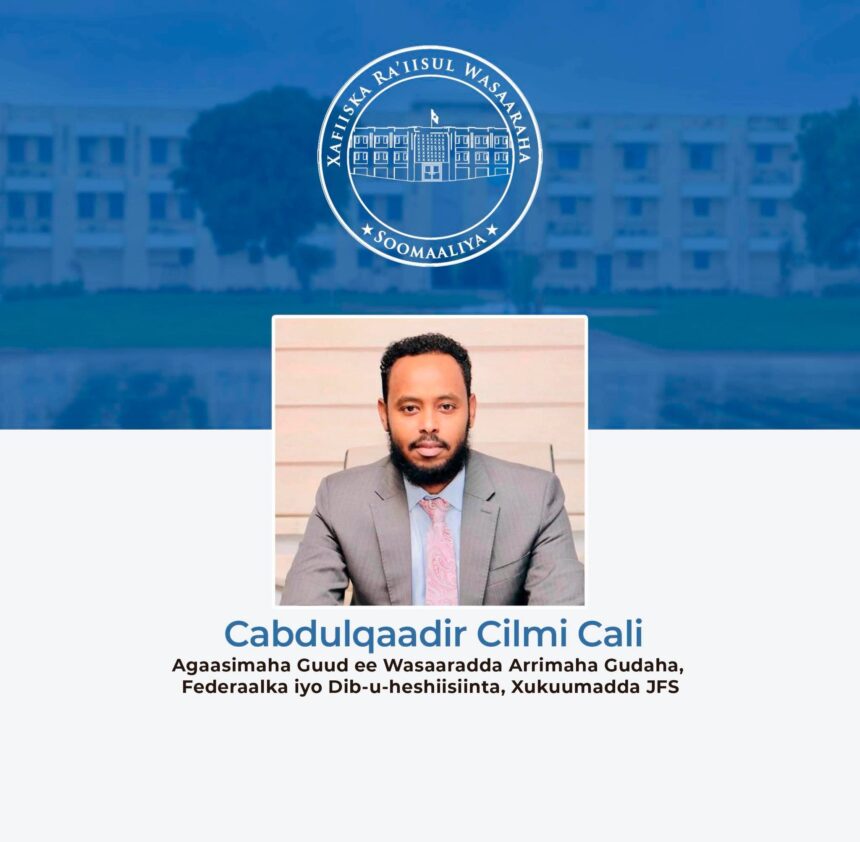 Muqdisho (SONNA): Ra’iisul Wasaaraha Xukuumadda Jamhuuriyadda Federaalka Soomaaliya mudane Xamsa Cabdi Barre ayaa Agaasimaha Guud ee Wasaaradda Arrimaha Gudaha, Federaalka iyo Dib-u-heshiisiinta u magacaabay mudane Cabdulqaadir Cilmi Cali.