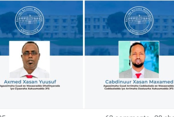 Muqdisho(SONNA):- Ra’iisul Wasaaraha Xukuumadda Jamhuuriyadda Federaalka Soomaaliya Mudane Xamsa Cabdi Barre ayaa Agaasimaha Guud ee Wasaaradda Dhallinyarada iyo Ciyaaraha Xukuumadda JFS u magacaabay Mudane Axmed Xasan Yuusuf , iyo Agaasimaha Guud Arrimaha Caddaalada ee Wasaaradda Caddaaladda iyo Arrimaha Dastuurka Xukuumadda JFS oo uu u magacaabay Cabdinuur Xasan Maxamed .