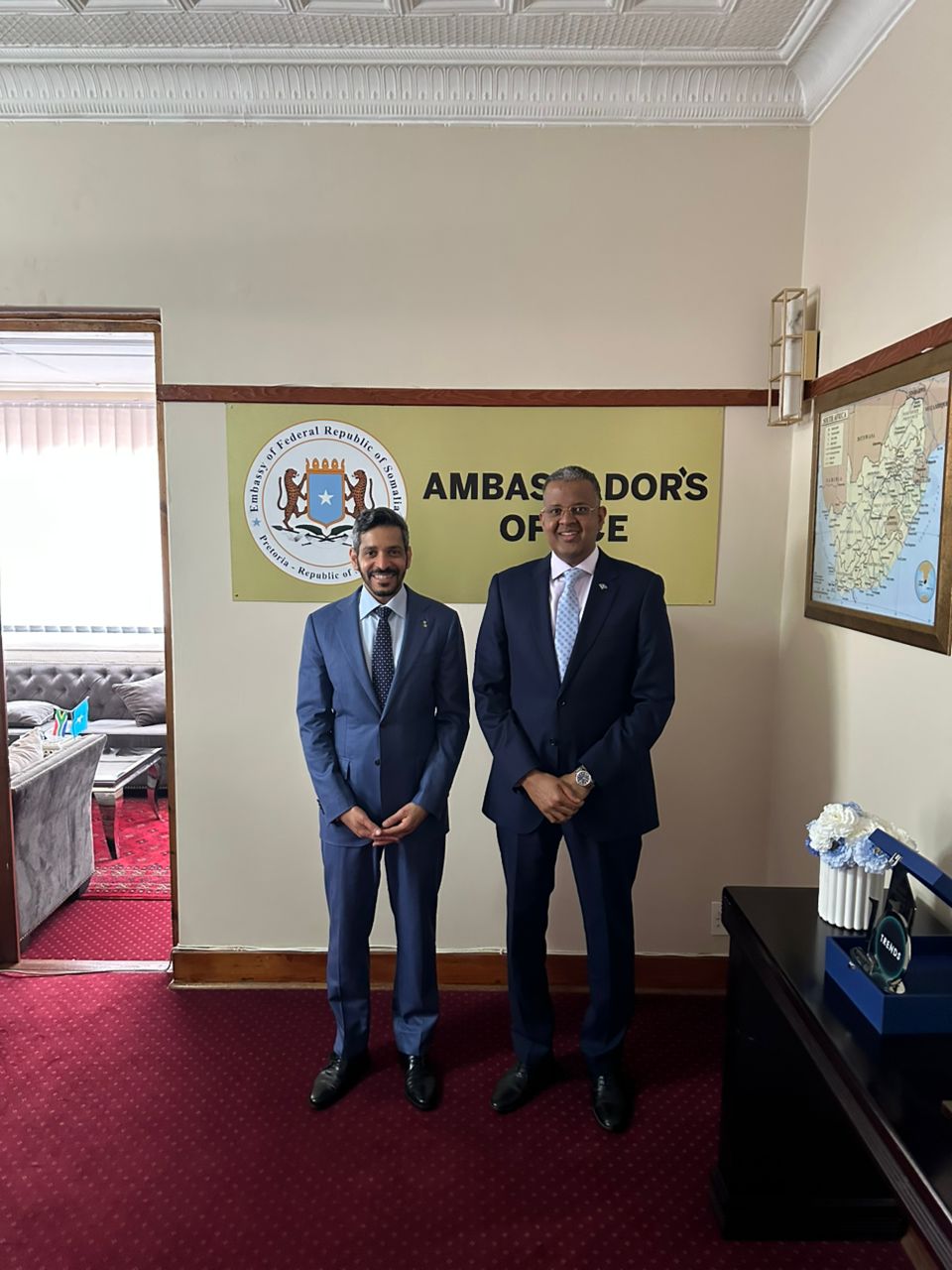 Pretoria(SONNA):-Waxaa Maanta Booqasho Sharafeed Ku yimid Xarunta Safaarada Soomaaliya Ee Dalka Koonfur Afrika Safiirka Boqortooyada Sacuudi Carabiya ee dalka Koonfur Afrika Amb Faysal Bin Falah Al Xarbi