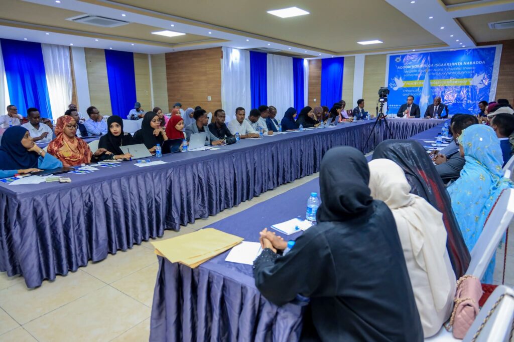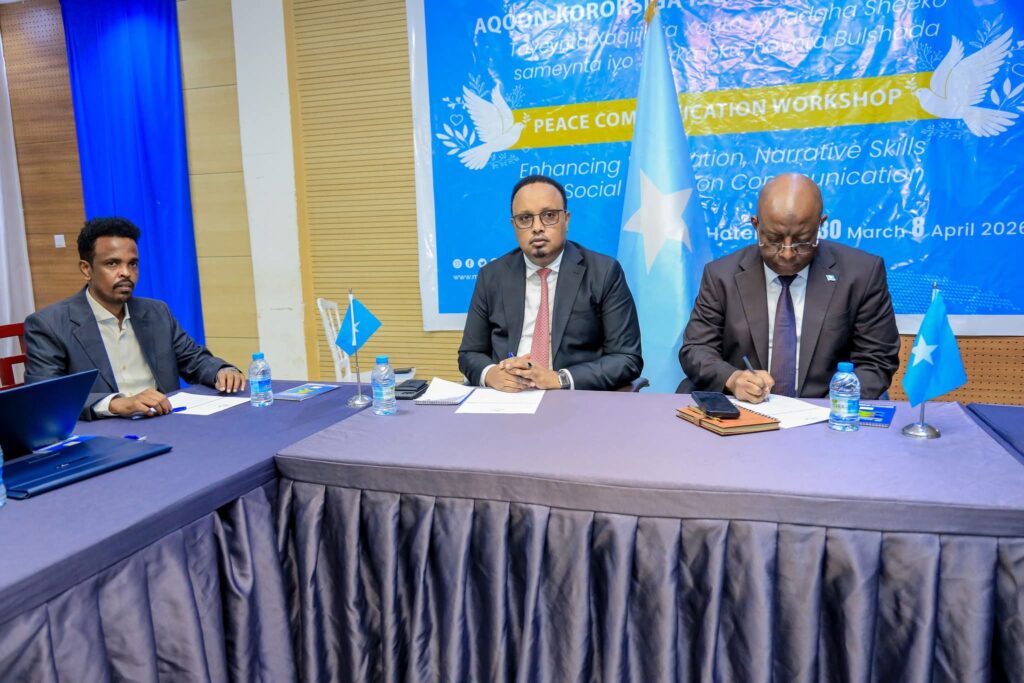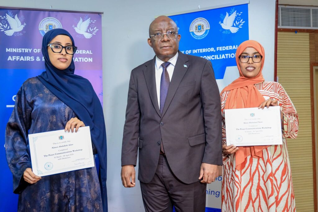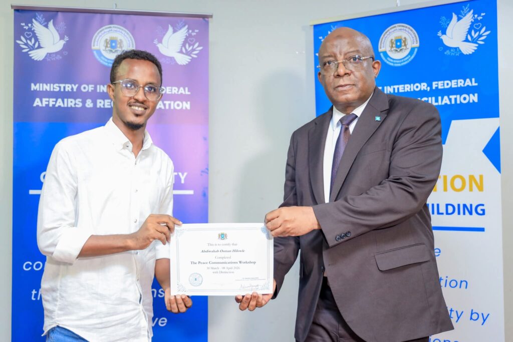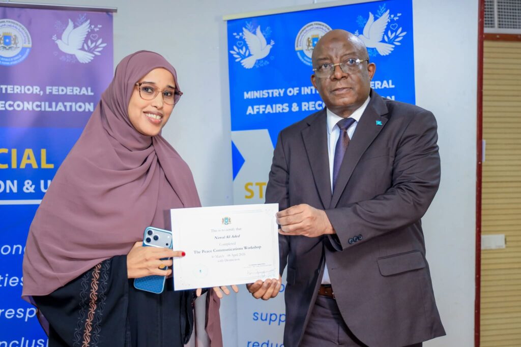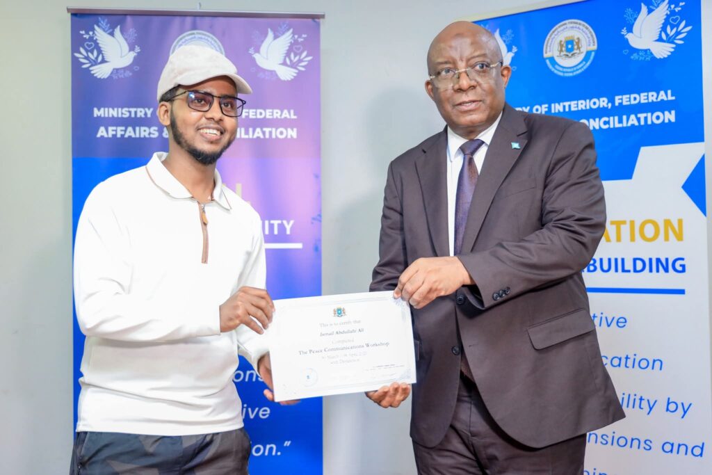 Muqdisho (SONNA): Wasiirka Wasaaradda Warfaafinta, Dhaqanka iyo Dalxiiska, Mudane Daa’uud Aweys Jaamac iyo Wasiir ku-xigeenka Wasaaradda Arrimaha Gudaha, Federaalka iyo Dib-u-heshiisiinta mudane Cabdixakiim Ashkir ayaa gudoonsiiyey shahaadooyinkii ka qaybgalayaasha ee Aqoon-kororsiga Warbaahinta Nabadda: Tayeynta Xaqiijinta Xogta, Xirfadaha Sheeko-sameynta iyo Xiriirka Isku-haynta Bulshada.