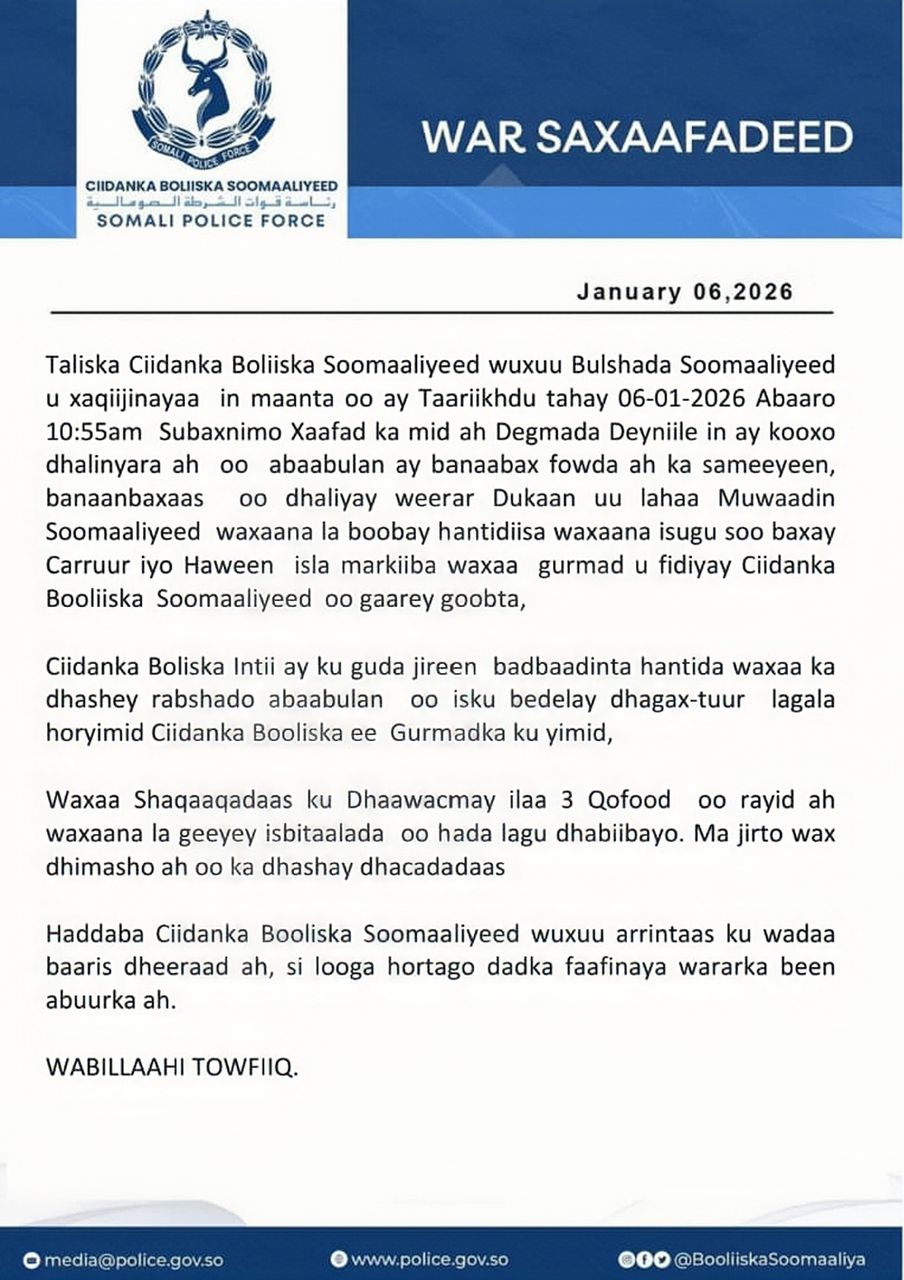 Muqdisho(SONNA):-Taliska Ciidanka Booliska Soomaaliyeed wuxuu Bulshada Soomaaliyeed u xaqiijinayaa in maanta oo ay Taariikhdu tahay 06-01-2026 Abaaro 10:55am Subaxnimo Xaafad ka mid ah Degmada Deyniile in ay kooxo dhalinyara ah oo abaabulan ay banaabax fowda ah ka sameeyeen, banaanbaxaas oo dhaliyay weerar Dukaan uu lahaa Muwaadin Soomaaliyeed waxaana la boobay hantidiisa waxaana isugu soo baxay Carruur iyo Haween isla markiiba waxaa gurmad u fidiyay Ciidanka Booliiska Soomaaliyeed oo gaarey goobta,