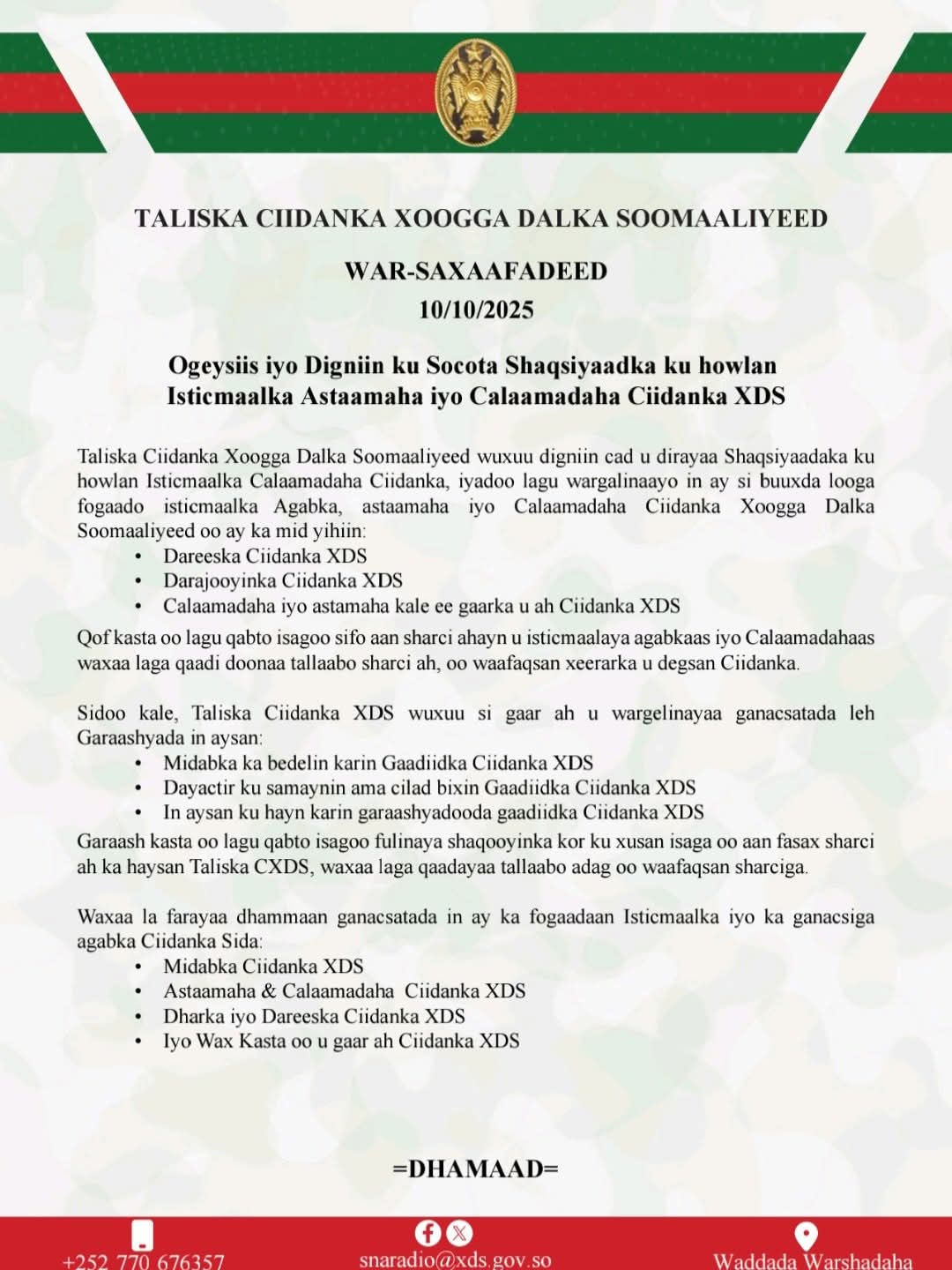Taliska Ciidanka Xoogga Dalka Soomaaliyeed ayaa soo saaray war-saxaafadeed uu ku caddeynayo digniin adag oo ku socota shaqsiyaadka ku hawlan isticmaalka calaamadaha iyo astaamaha gaarka u ah Ciidanka XDS, iyadoo lagu amray in si buuxda looga fogaado isticmaalka agabkaas aan sharciyeysneyn.