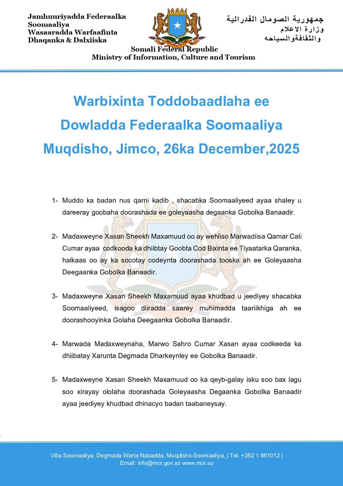3- Madaxweyne Xasan Sheekh Maxamuud ayaa khudbad u jeediyey shacabka Soomaaliyeed, isagoo diiradda saarey muhimadda taariikhiga ah ee doorashooyinka Golaha Deegaanka Gobolka Banaadir.