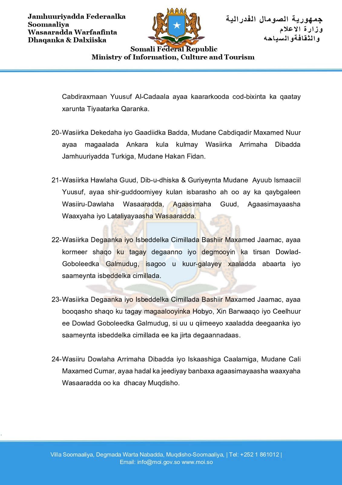 14- Ra’iisul Wasaare Ku-Xigeenka Labaad ee Soomaaliya, Mudane Jibriil Cabdirashiid Xaaji Cabdi, ayaa maanta xilka u kala wareejiyay Wasiirka cusub ee Wasaaradda Howlaha Guud, Dib-u-dhiska iyo Guriyeynta, Mudane Ayuub Ismaaciil Yuusuf, iyo Wasiirkii hore, Mudane Cilmi Maxamuud Nuur.