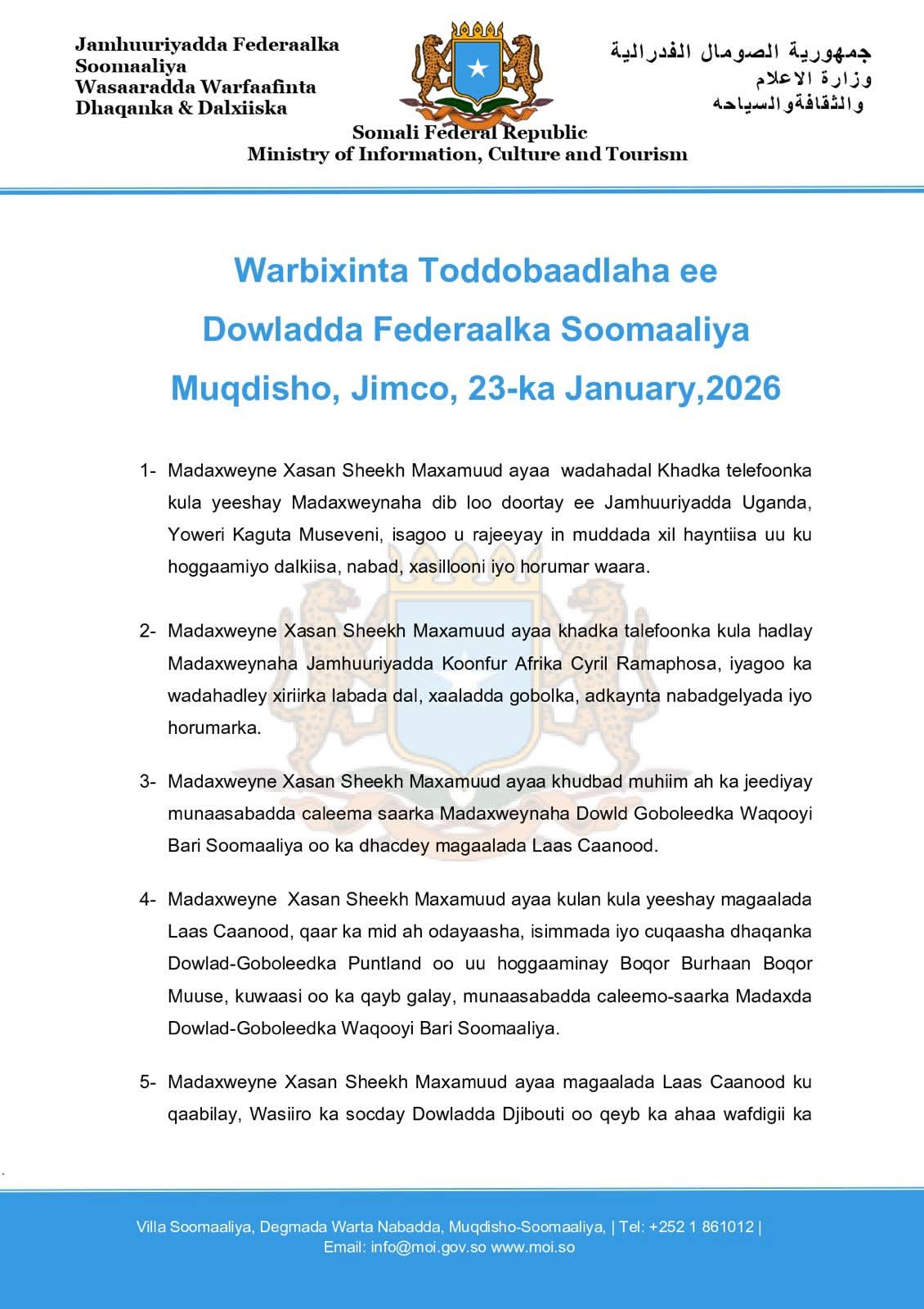 Dowladda Federaalka Soomaaliya Muqdisho, Jimco, 23-ka January,2026