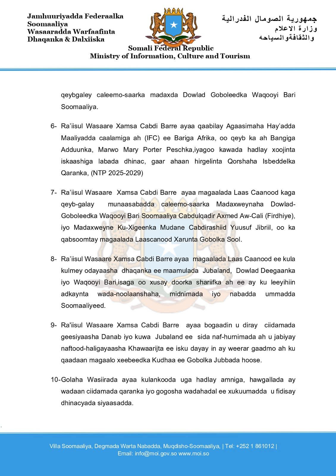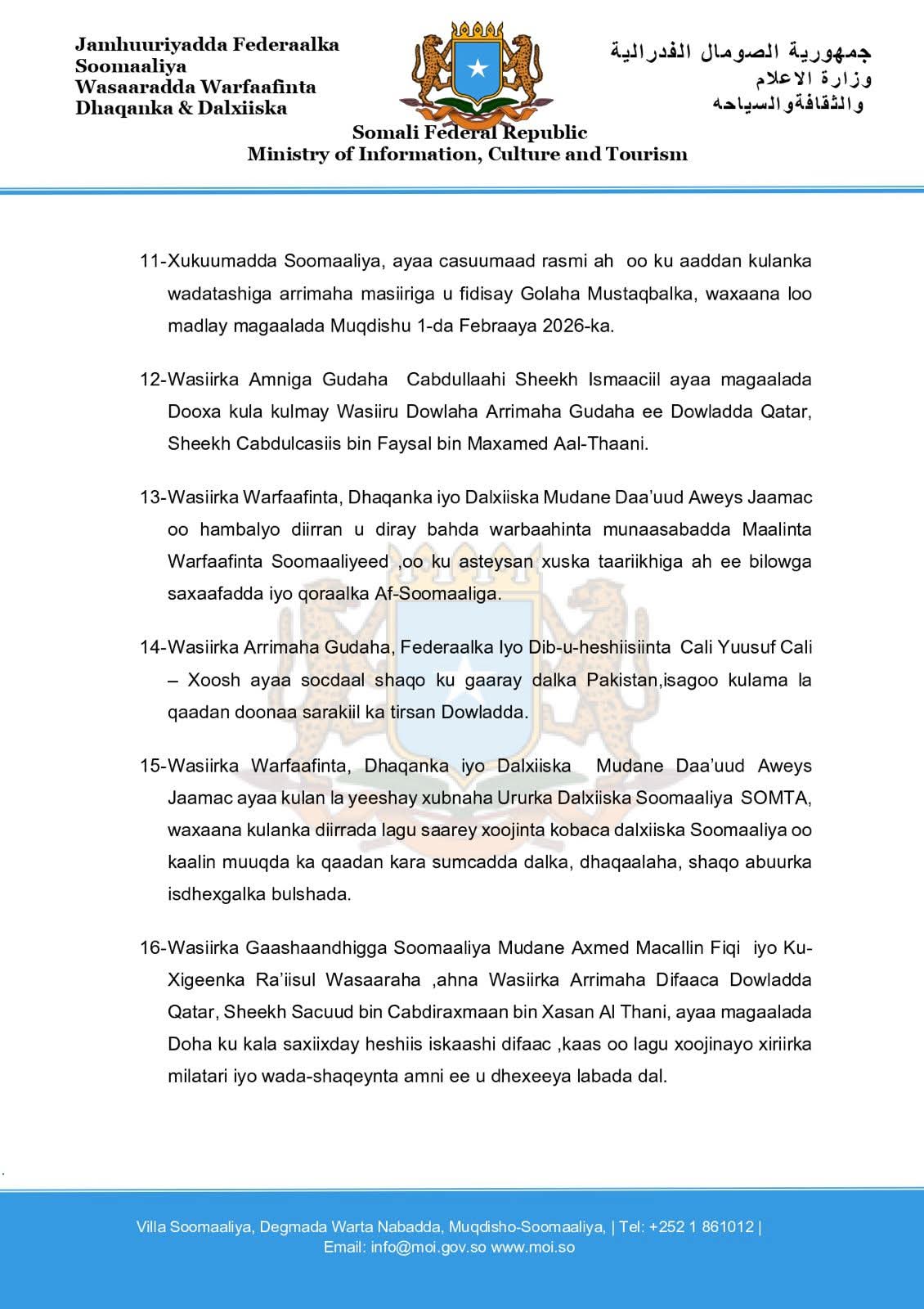 11- Xukuumadda Soomaaliya, ayaa casuumaad rasmi ah oo ku aaddan kulanka wadatashiga arrimaha masiiriga u fidisay Golaha Mustaqbalka, waxaana loo madlay magaalada Muqdishu 1-da Febraaya 2026-ka.