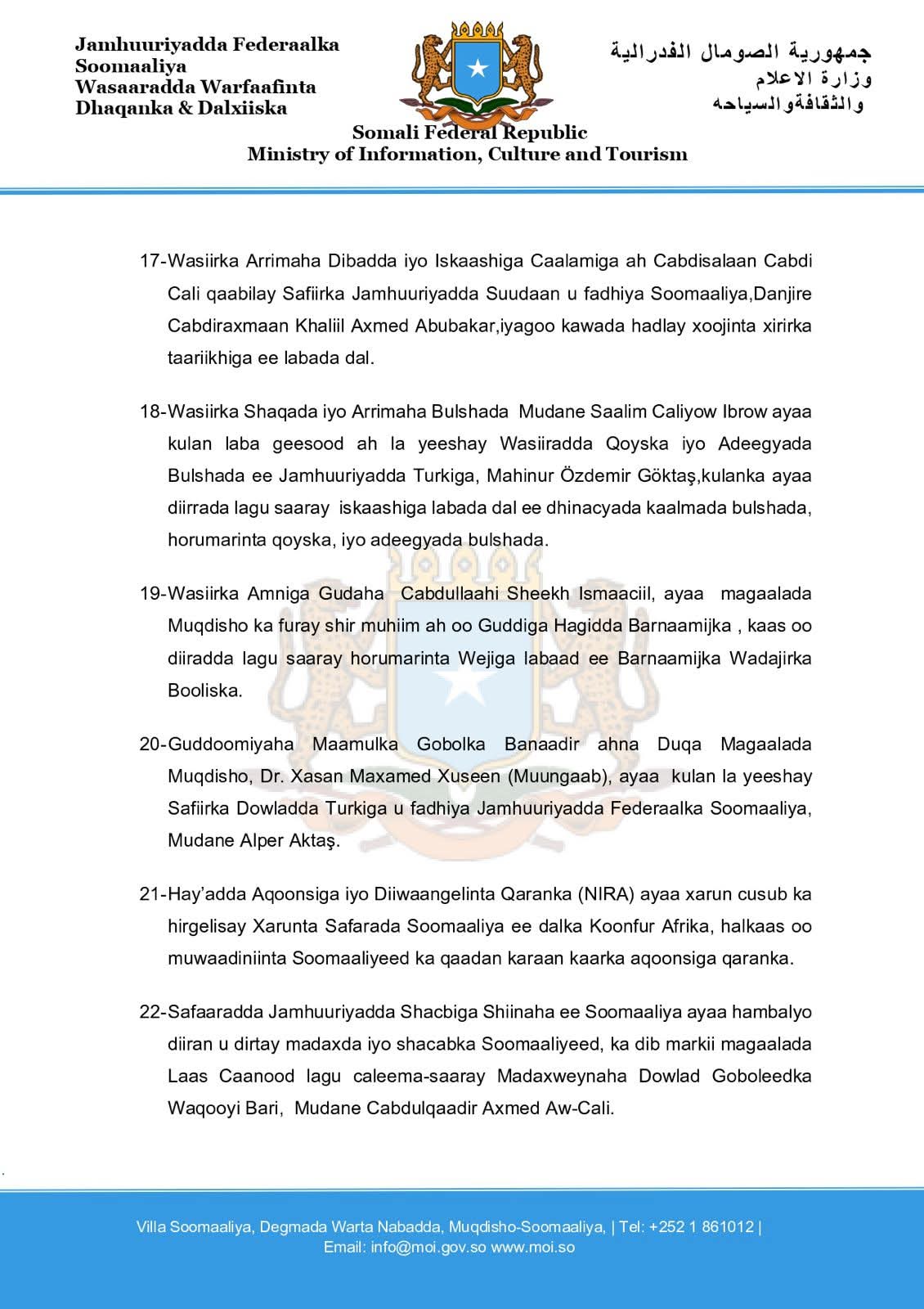 18- Wasiirka Shaqada iyo Arrimaha Bulshada Mudane Saalim Caliyow Ibrow ayaa kulan laba geesood ah la yeeshay Wasiiradda Qoyska iyo Adeegyada Bulshada ee Jamhuuriyadda Turkiga, Mahinur Özdemir Göktaş,kulanka ayaa diirrada lagu saaray iskaashiga labada dal ee dhinacyada kaalmada bulshada, horumarinta qoyska, iyo adeegyada bulshada.