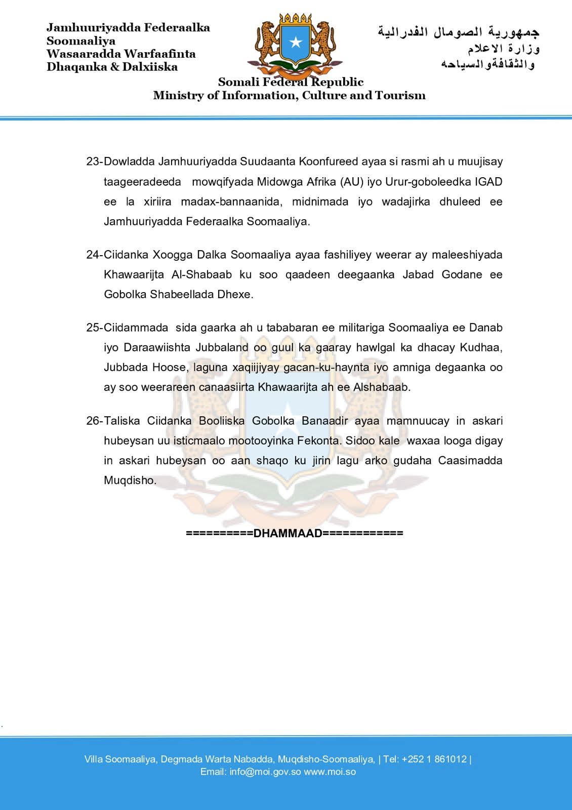 23- Dowladda Jamhuuriyadda Suudaanta Koonfureed ayaa si rasmi ah u muujisay taageeradeeda mowqifyada Midowga Afrika (AU) iyo Urur-goboleedka IGAD ee la xiriira madax-bannaanida, midnimada iyo wadajirka dhuleed ee Jamhuuriyadda Federaalka Soomaaliya.