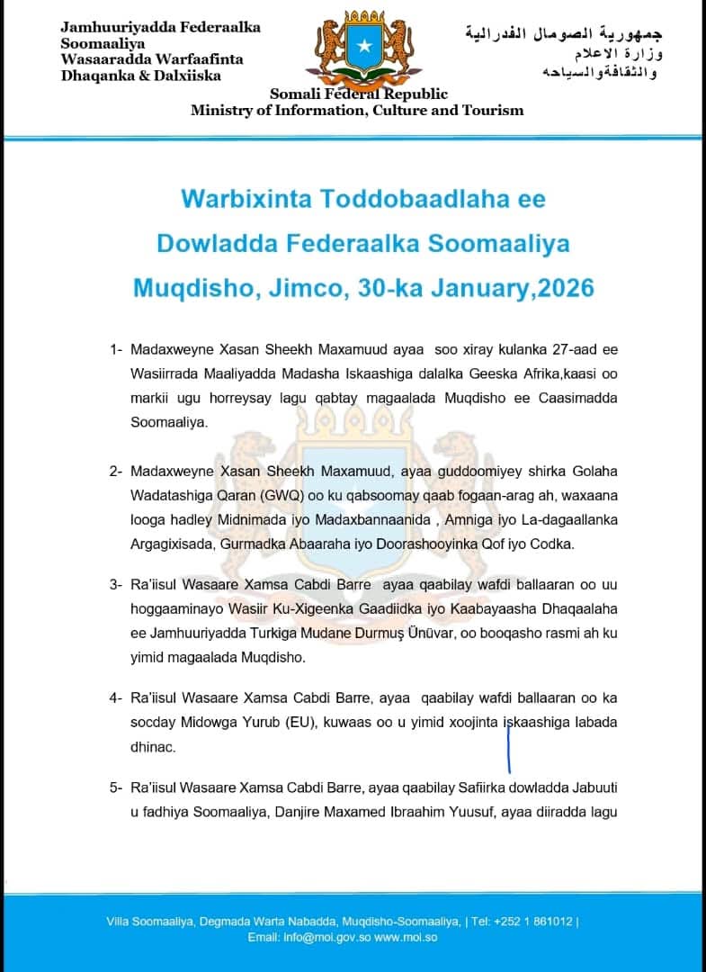 Dowladda Federaalka Soomaaliy Muqdisho, Jimco, 30-ka January,2026