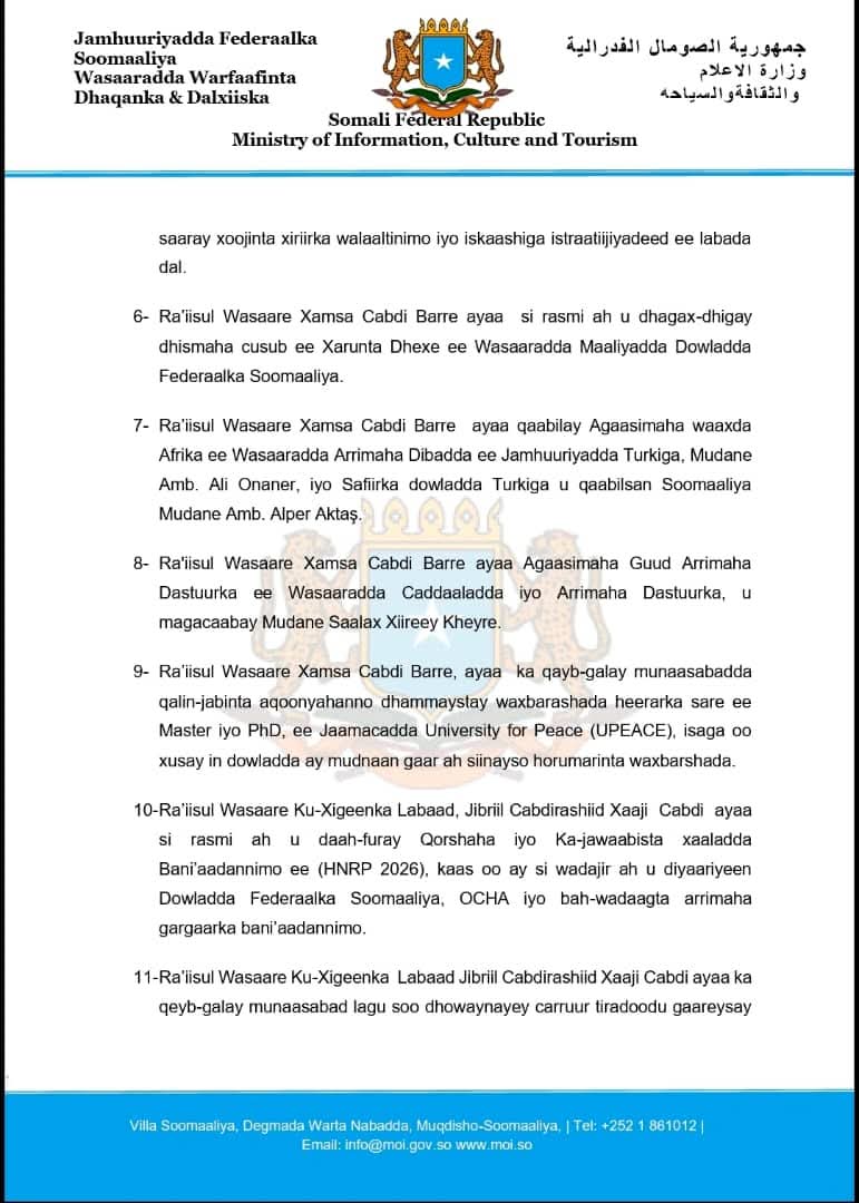 10- Raโiisul Wasaare Ku-Xigeenka Labaad, Jibriil Cabdirashiid Xaaji Cabdi ayaa si rasmi ah u daah-furay Qorshaha iyo Ka-jawaabista xaaladda Baniโaadannimo ee (HNRP 2026), kaas oo ay si wadajir ah u diyaariyeen Dowladda Federaalka Soomaaliya, OCHA iyo bah-wadaagta arrimaha gargaarka baniโaadannimo.