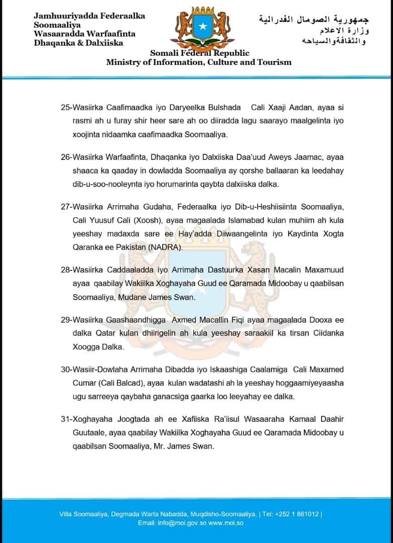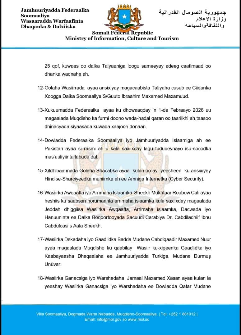 13- Xukuumadda Federaalka ayaa ku dhowaaqday in 1-da Febraayo 2026 uu magaalada Muqdisho ka furmi doono wada-hadal qaran oo taariikhi ah,taasoo dhinacyada siyaasada kuwada xaajoon donaan.