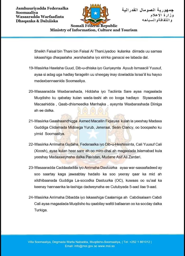 24- Wasiirka Arrimaha Dibadda iyo Iskaashiga Caalamiga ah Cabdisalaam Cabdi Cali ayaa magaalada Muqdisho ku qaabilay wafdi ballaaran oo ka socday dalka Turkiga.