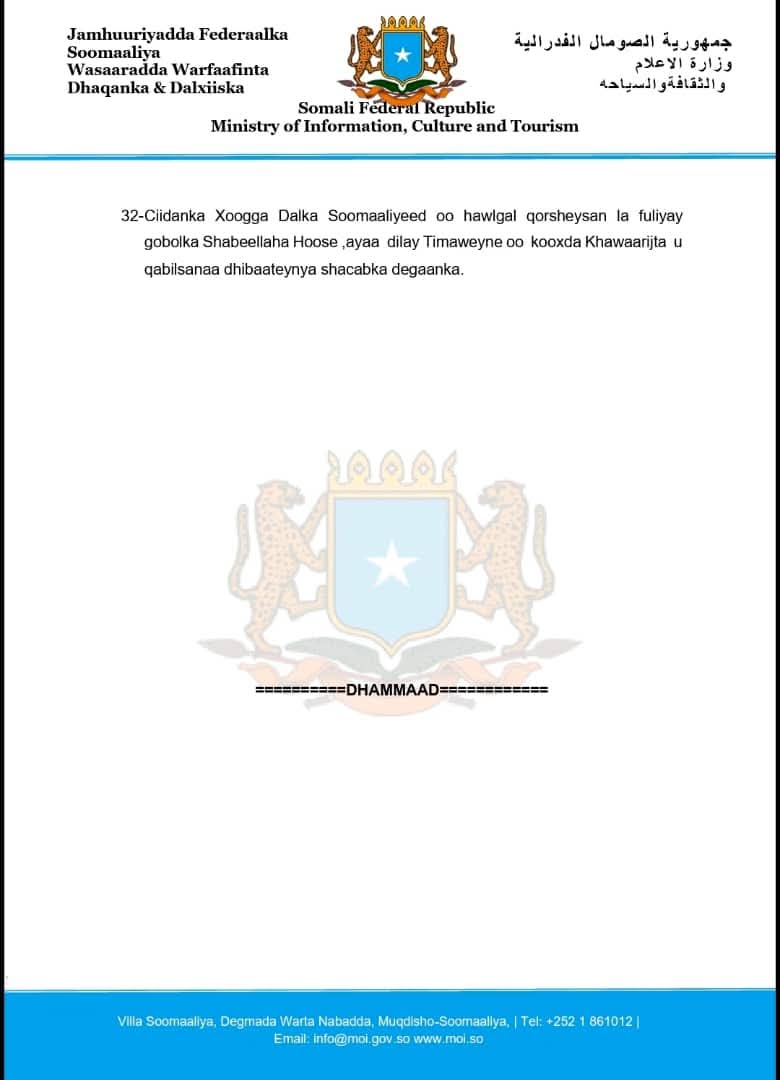 23- Wasaaradda Caddaaladda iyo Arrimaha Dastuurka ayaa war-saxaafadeed ay soo saartay kaga jawaabtay hadallo ka soo yeeray qaar ka mid ah xildhibaanada Guddiga La-socodka Dastuurka (OC), kuwaas oo suโaal ka keenay hannaanka la-tashiga dadweynaha ee Cutubyada 5-aad ilaa 9-aad.