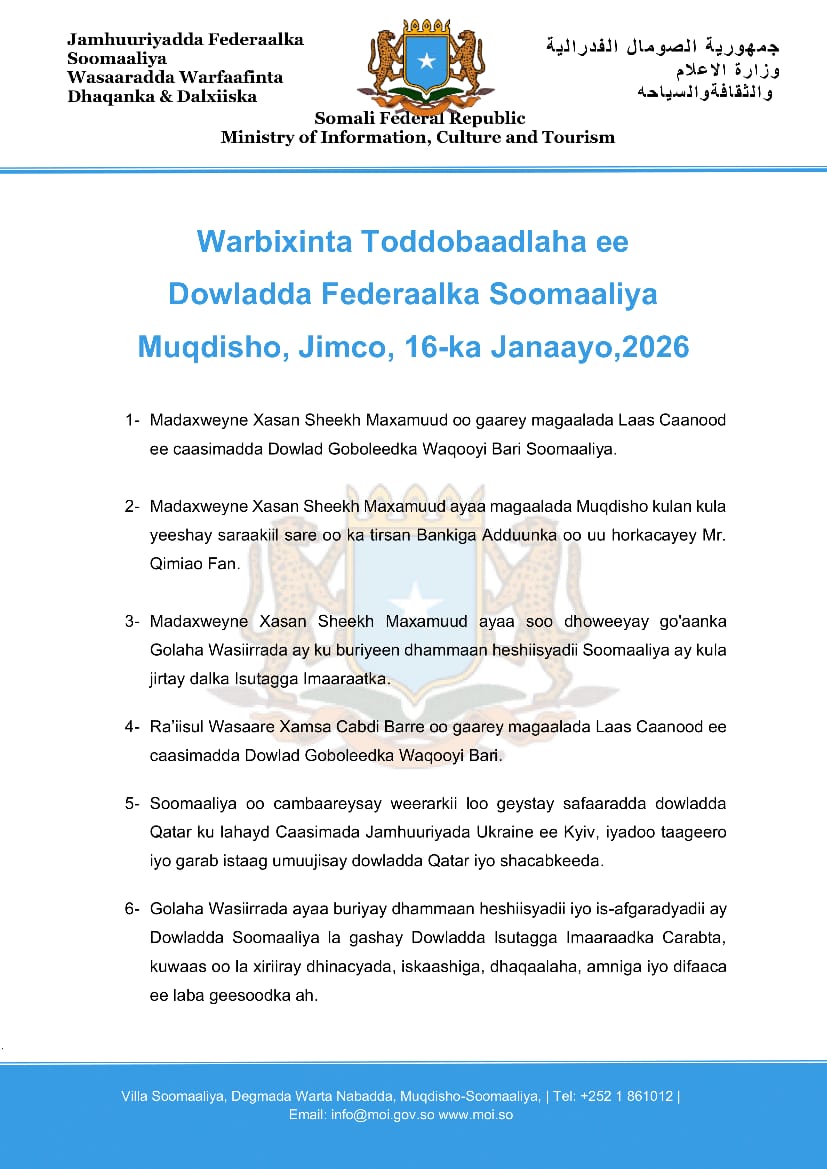 Warbixinta Toddobaadlaha ee Dowladda Federaalka Soomaaliya Muqdisho, Jimco, 16-ka Janaayo,2026