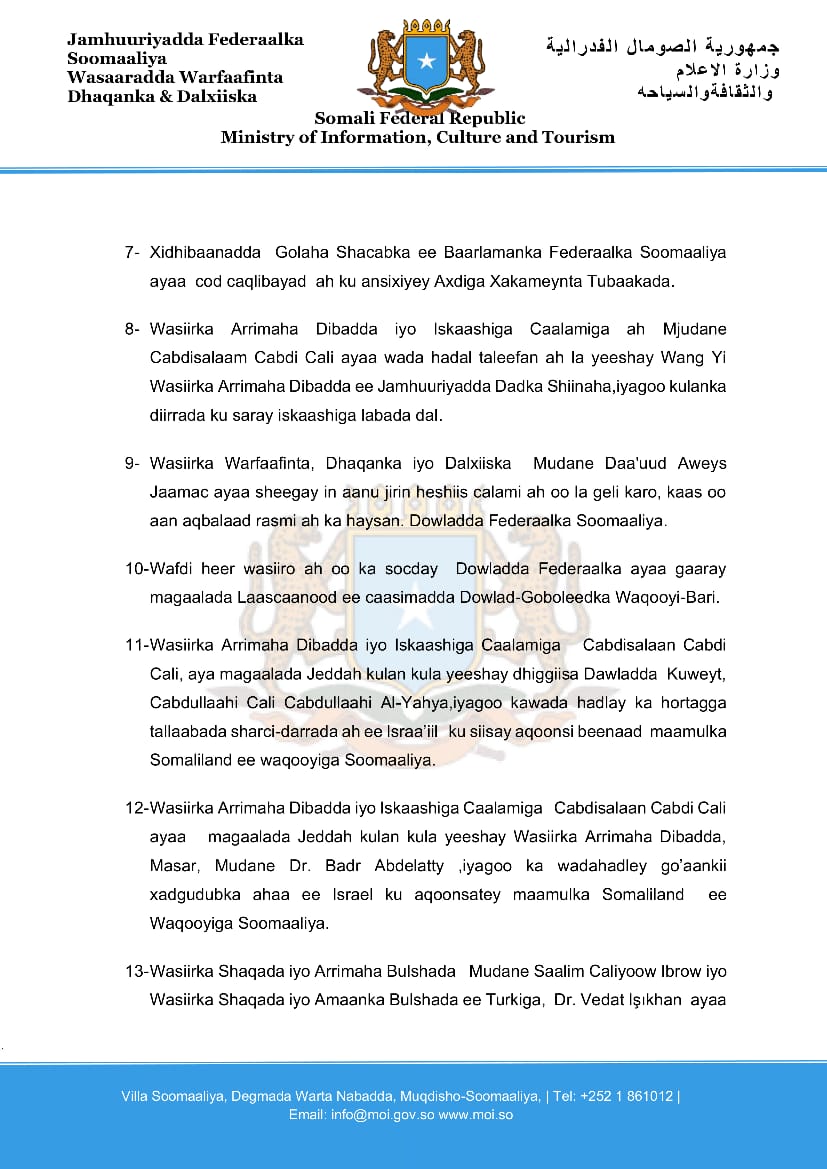 8- Wasiirka Arrimaha Dibadda iyo Iskaashiga Caalamiga ah Mjudane Cabdisalaam Cabdi Cali ayaa wada hadal taleefan ah la yeeshay Wang Yi Wasiirka Arrimaha Dibadda ee Jamhuuriyadda Dadka Shiinaha,iyagoo kulanka diirrada ku saray iskaashiga labada dal.