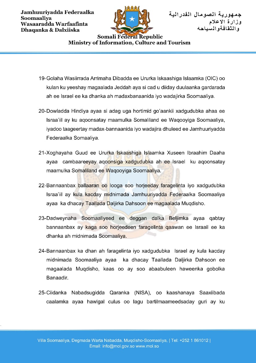 20- Dowladda Hindiya ayaa si adag uga hortimid goโ€™aankii xadgudubka ahaa ee Israaโ€™iil ay ku aqoonsatay maamulka Somaliland ee Waqooyiga Soomaaliya, iyadoo taageertay madax-bannaanida iyo wadajira dhuleed ee Jamhuuriyadda Federaalka Somaaliya.