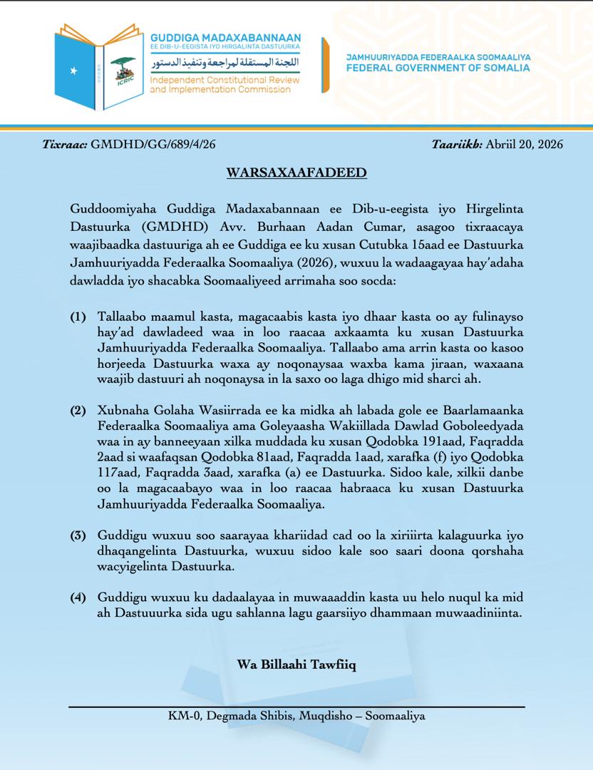 Muqdisho(SONNA):-Guddoomiyaha Guddiga Madaxabannaan ee Dib-u-eegista iyo Hirgelinta Dastuurka (GMDHD) Avv. Burhaan Aadan Cumar, asagoo tixraacaya waajibaadka dastuuriga ah ee Guddiga ee ku xusan Cutubka 15aad ee Dastuurka Jamhuuriyadda Federaalka Soomaaliya (2026), wuxuu la wadaagayaa hay’adaha