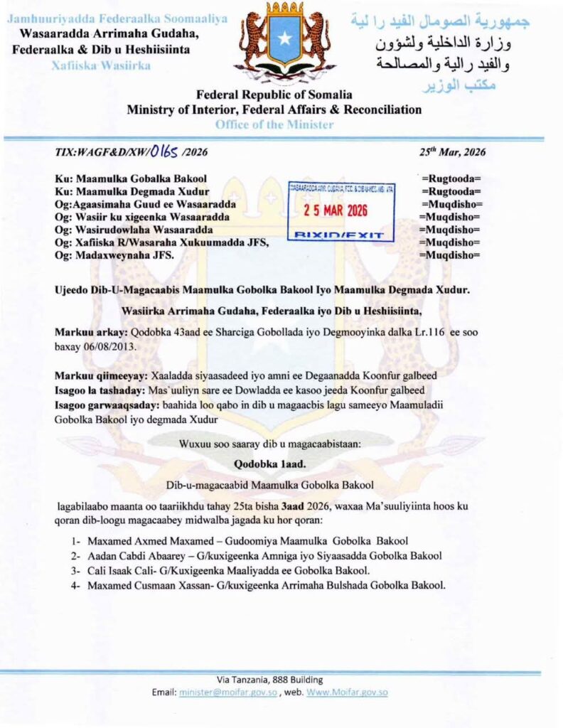 Muqdisho (SONNA): Wasaaradda arrimaha Gudaha dowladda FS ayaa dib u magacawday xubnihii maamulka gobolka Bakool,…