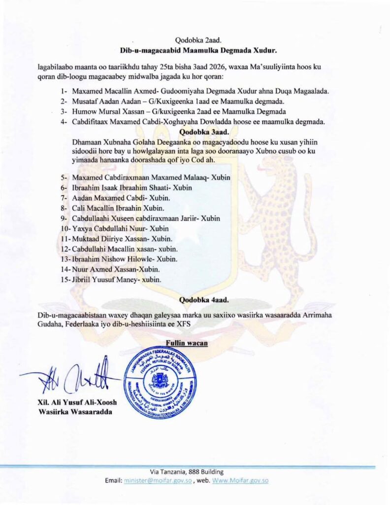 Muqdisho (SONNA): Wasaaradda arrimaha Gudaha dowladda FS ayaa dib u magacawday xubnihii maamulka gobolka Bakool, kan degmada Xudur iyo golaha deegaanka degmadaas.