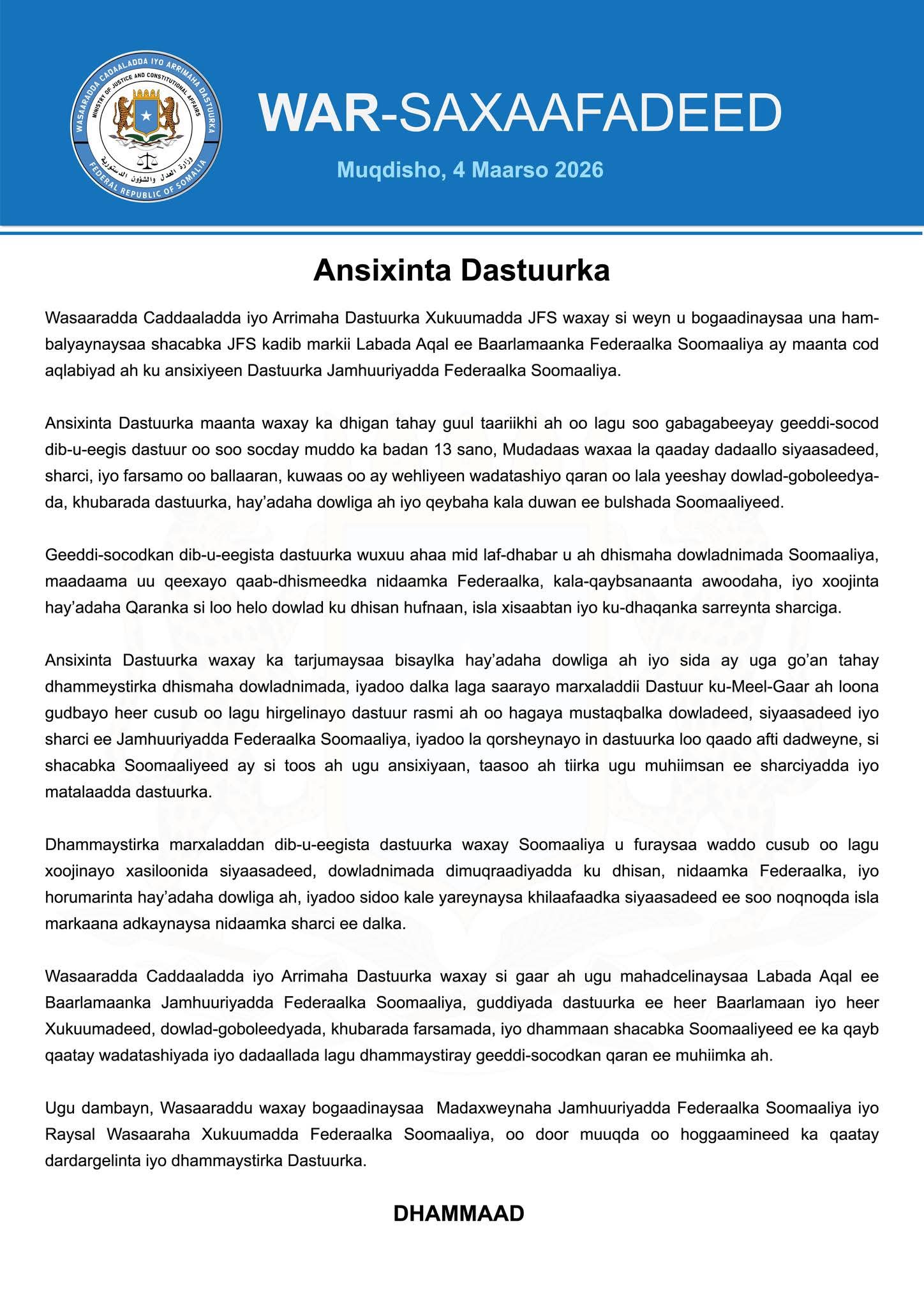 Ugu dambeyn, Wasaaraddu waxay bogaadisay Madaxweynaha iyo Ra’iisul Wasaaraha dalka oo hoggaamin muuqata ka qaatay dardargelinta iyo dhammaystirka Dastuurka, iyadoo ku tilmaantay tallaabadan mid xoojinaysa dimuqraadiyadda, midnimada qaranka iyo hirgelinta nidaam dowladeed oo sharci ku dhisan.