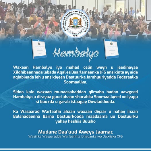 Muqdisho.SONNA…Wasaaradda Warfaafinta Dhaqanka iyo Dalxiiska ee XFS ayaa soo dhoweynaysaa ansixinta Baarlamaanka Federaalka Soomaaliya ee loo qaaday dhameystirka Dastuurka Jamhuuriyadda Federaalka Soomaaliya.