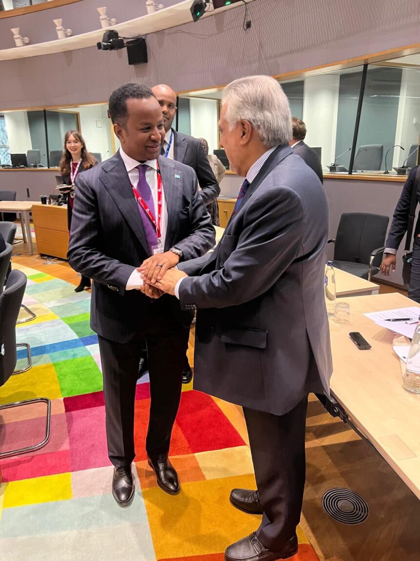 Muqdisho(SONNA):-Wasiirka Arrimaha Dibadda iyo Iskaashiga Caalamiga ah ee Jamhuuriyadda Federaalka Soomaaliya, Mudane Abdisalam Abdi Ali, ayaa maanta kulan miro-dhal ah la qaatay Ra’iisul Wasaare Ku-xigeenka ahna Wasiirka Arrimaha Dibadda ee Jamhuuriyadda Islaamiga ah ee Pakistan, Senator Mohammad Ishaq Dar, xilli uu socday Shirka 4-aad ee Madasha Wasiirrada EU Indo-Pacific oo ka furmay magaalada Brussels.