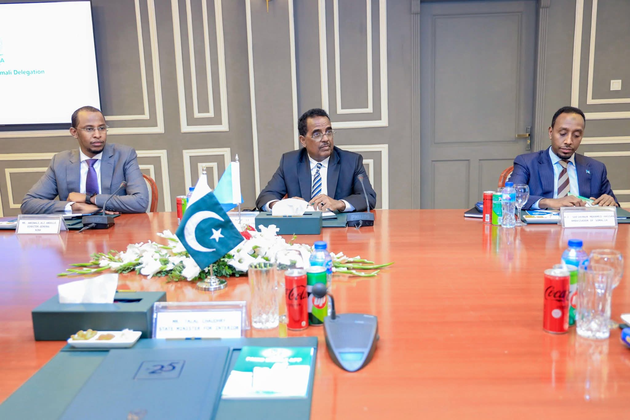 Muqdisho(SONNA):-Wasiirka Arrimaha Gudaha, Federaalka iyo Dib-u-Heshiisiinta Xukuumadda Federaalka Soomaaliya, Mudane Hon Cali Yuusuf Cali- Xoosh ayaa kulan kula yeeshay magaalada Islamabad Guddoomiyaha Hayโ€™adda Diiwaangelinta iyo Kaydinta Xogta Qaranka ee Pakistan (NADRA). Kulanka waxaa Wasiirka ku wehliyey Mareeyaha Guud ee Hay’adda Aqoonsiga Qaranka (NIRA), Mudane Cabdiwali Cali Cabdulle (Timacadde)