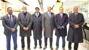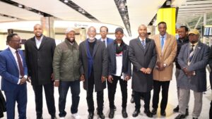 Safiirka Soomaaliya u fadhiya UK Danjire Cabdulqaadir Cabdi Xaashi iyo xubno ka tirsan jaaliyadda Soomaaliyeed ayaa garoonka diyaaradaha ee Heathrow si weyn ugu soo dhaweeyay.