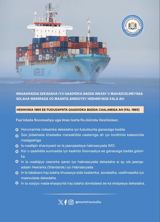 Wasiirka ayaa xusay in Ku biirista FAL 1965, muhiimaddeedu tahay fududeynta iyo mideynta habraacyada maraakiibta marka ay imanayaan ama ka baxayaan dekedaha caalamiga ah, si loo yareeyo dib-u-dhacyada, loona kordhiyo hubantida iyo waafajinta heerarka caalamiga ah.