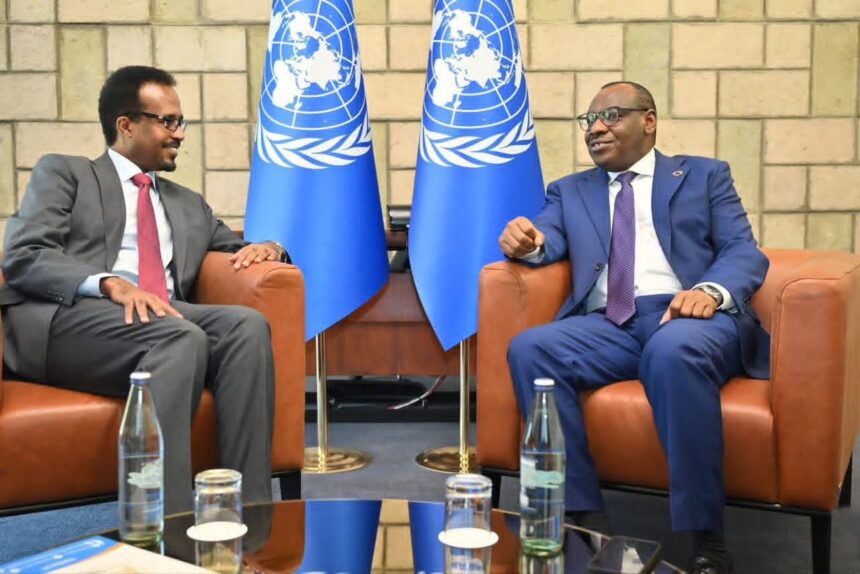 Addis Ababa (SONNA): Wasiirka Ganacsiga iyo Warshadaha ee Xukuumadda Federaalka Soomaaliya Mudane Jamaal Maxamed Xasan, ayaa magaalada Addis Ababa kula kulmay Mudane Claver Gatete, oo ah Ergeyga Gaarka ah ee Xoghayaha Guud ee Qaramada Midoobay u qaabilsan Afrika, isla markaana ah Madaxa United Nations Economic Commission for Africa.