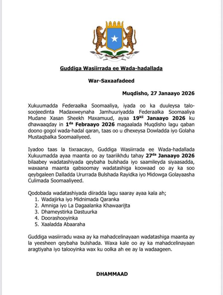 Muqdisho (SONNA): Xukuumadda Federaalka Soomaaliya, oo ka duuleysa talo-soojeedinta Madaxweynaha JFS Mudane Xasan Sheekh Maxamuud, ayaa 19-kii bishaan ku dhawaaqday in 1-da Febraayo 2026 magaalada Muqdisho ay ka furmeyso gogol wada-hadal qaran oo u dhexeysa Dowladda iyo Golaha Mustaqbalka Soomaaliyeed.